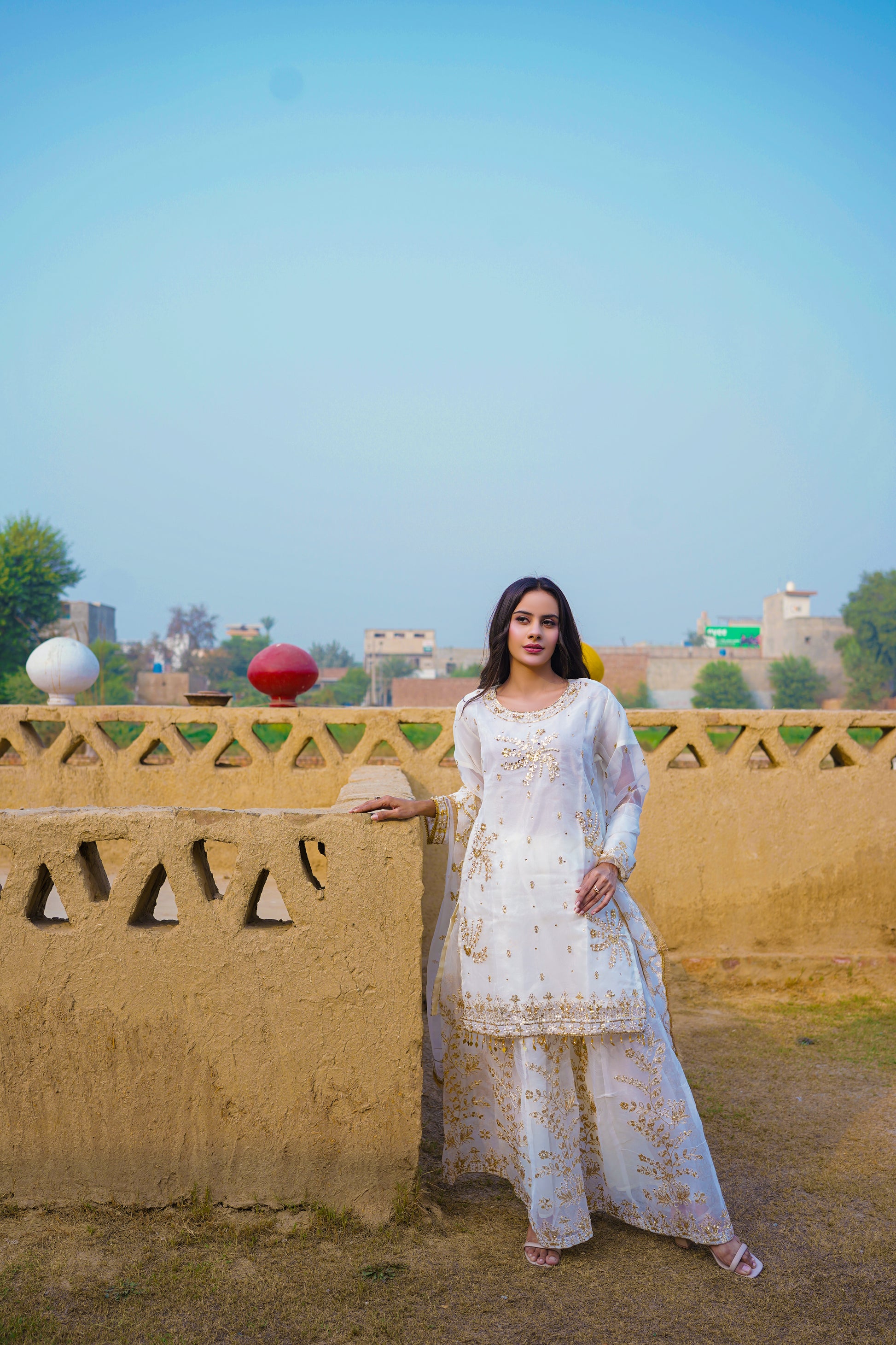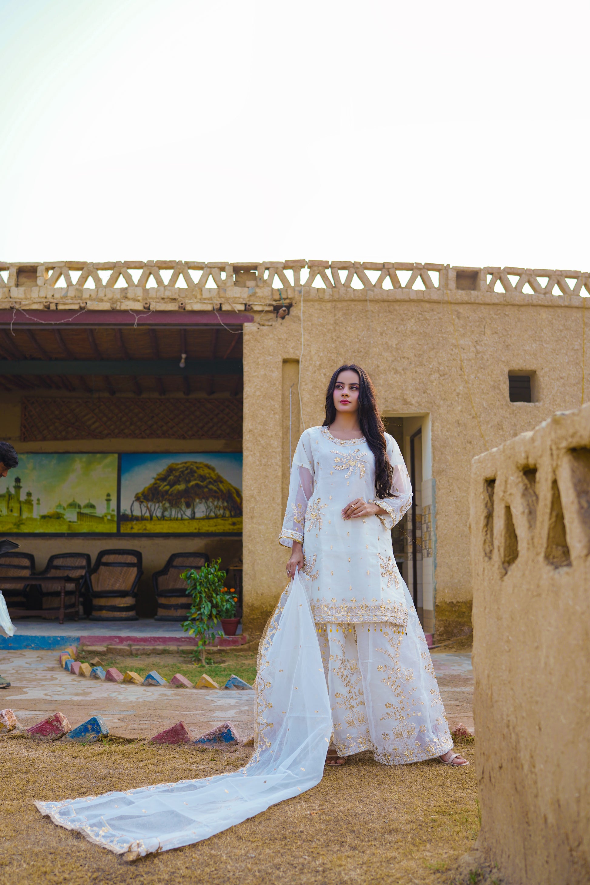 Crafted in a serene white base, Mehré Gilded Whisper features delicate golden floral embroidery with refined hand embellishments that shimmer subtly with every movement. Sheer sleeves and intricate detailing create a silhouette that feels light, feminine, and timeless—an effortless blend of tradition and modern elegance.