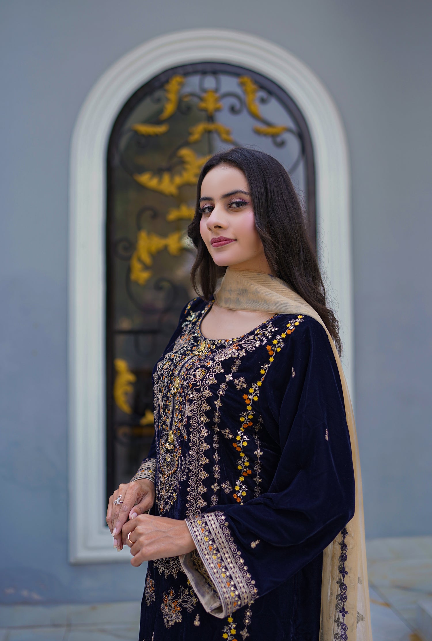 A handcrafted winter dress inspired by South Asian heritage — designed for elegance, warmth, and statement occasions