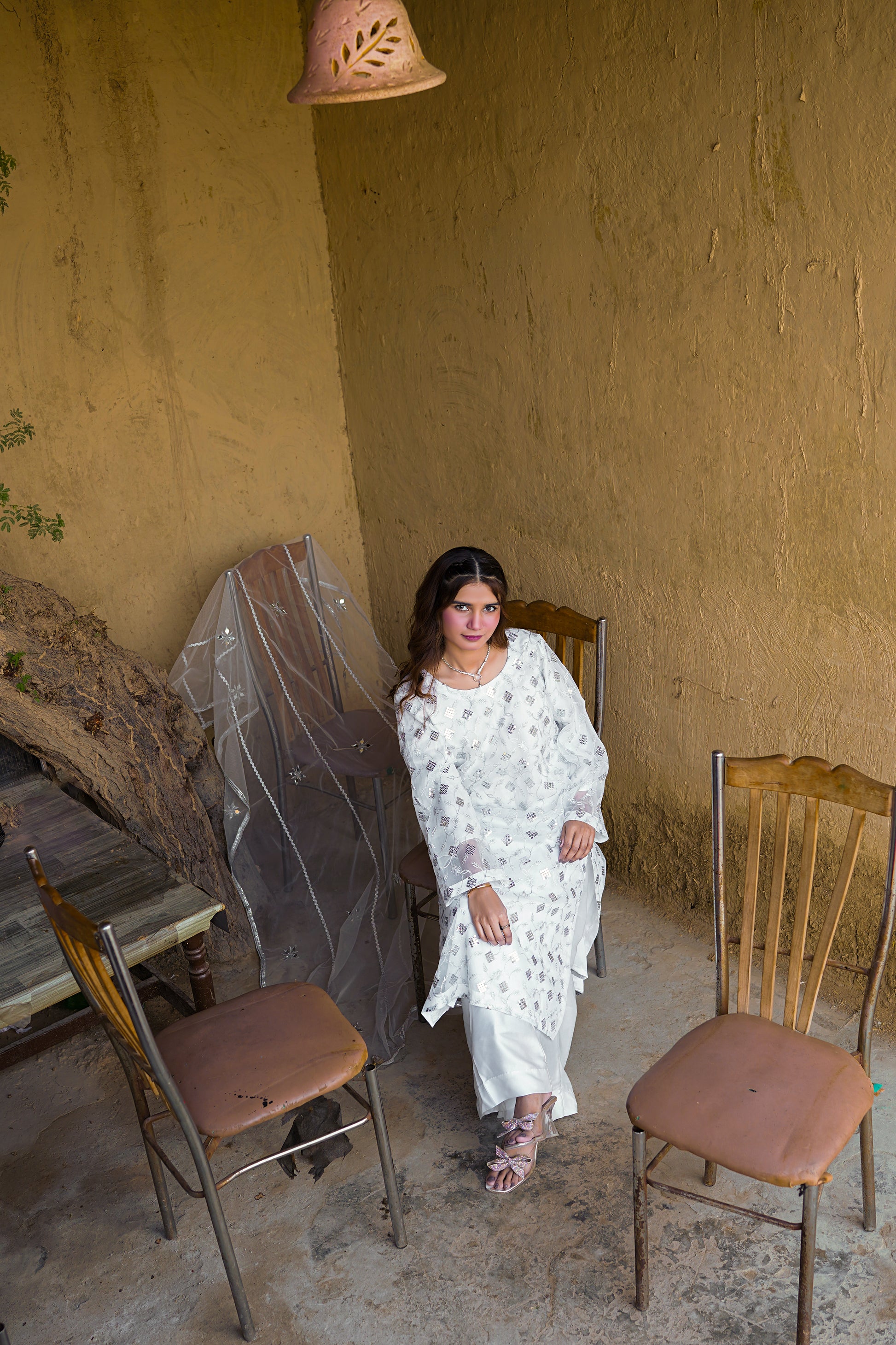 Crafted in a soft ivory base, Mehré Ivory Éclat is elevated with delicate geometric embellishments that catch the light with understated brilliance. The sheer embroidered sleeves add an airy elegance, creating a silhouette that feels both graceful and contemporary.