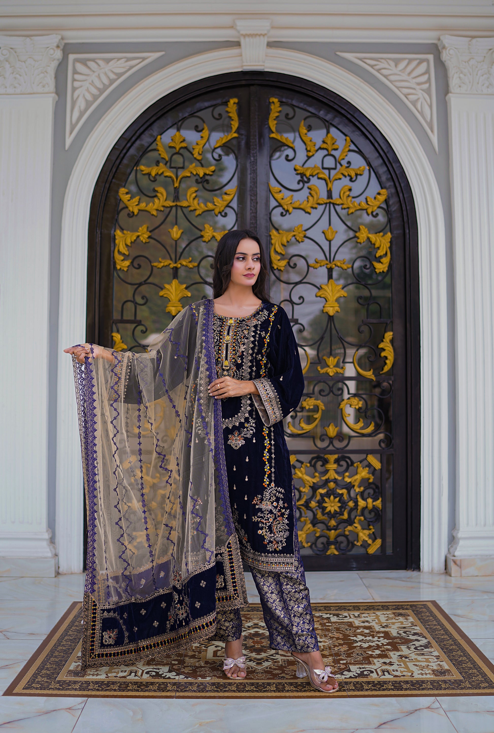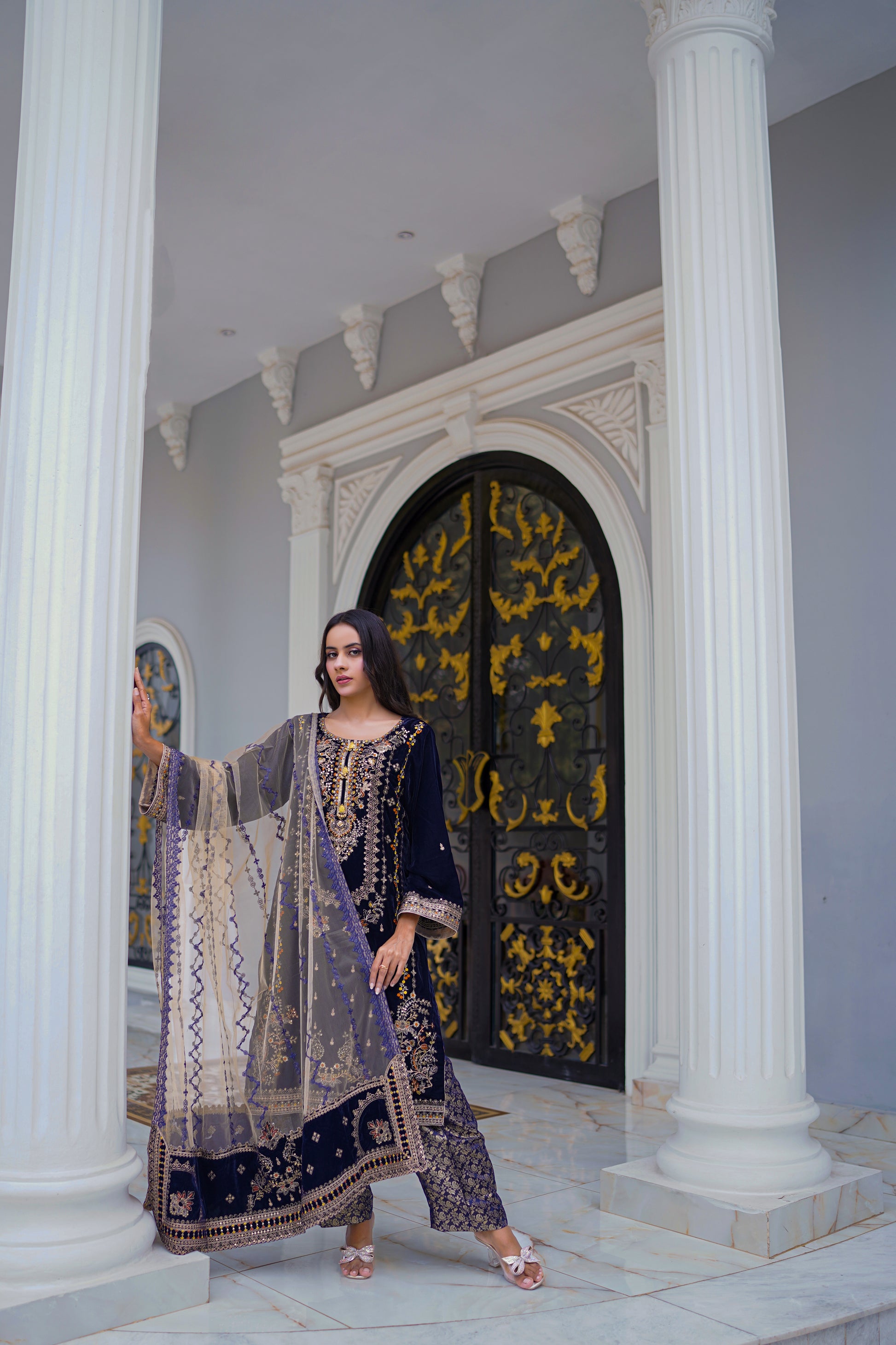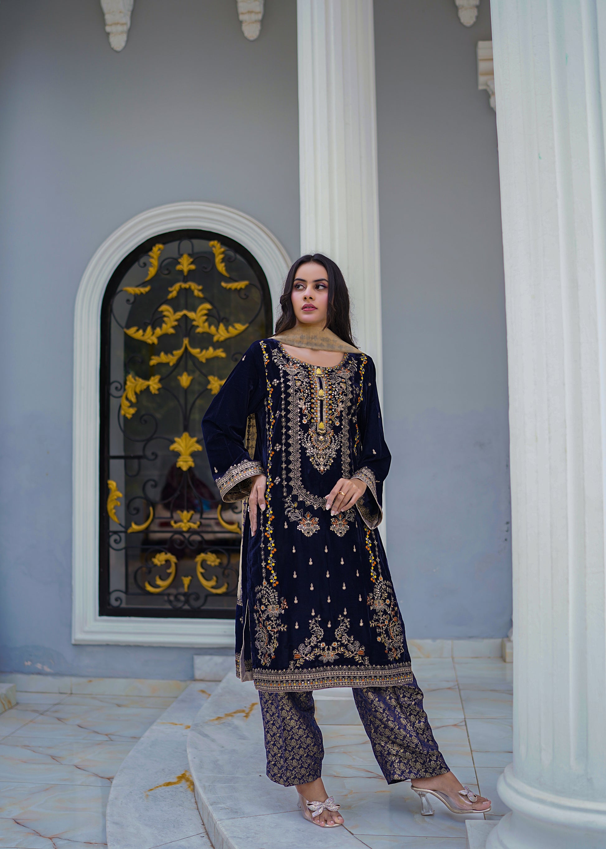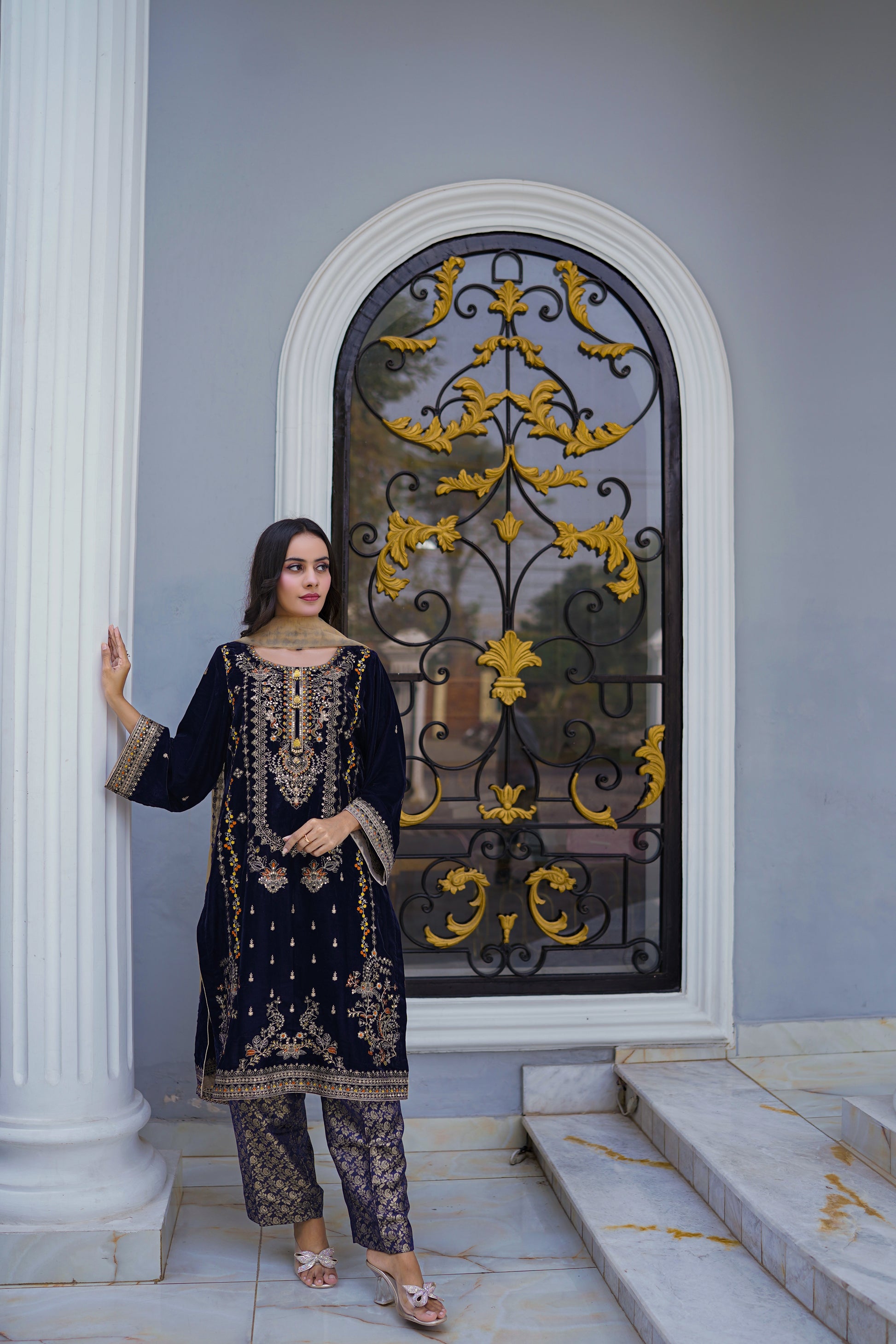 Designed for nights that call for presence, this velvet partywear dress blends timeless desi glamour with a contemporary silhouette. The plush texture, fluid fall, and refined detailing make it ideal for festive gatherings, winter celebrations, and intimate soirées.