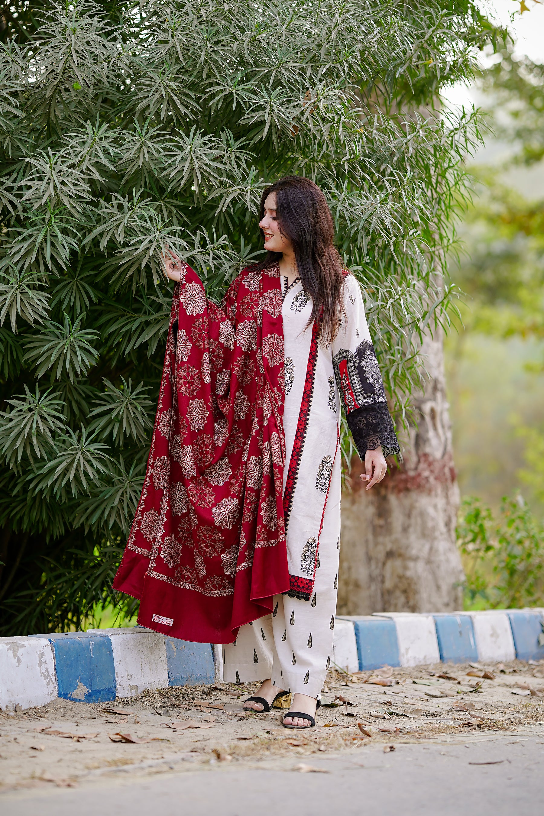 This shawl is made from warm, textured khaddar and designed with snowflake-inspired Phulkari embroidery that adds a seasonal, cozy feel. The deep red base gives it a classic winter look, while the detailed stitching brings a touch of traditional charm. Its thicker fabric makes it ideal for colder months, everyday wear, or family gatherings. Easy to style with simple outfits, this shawl offers both comfort and a clean, traditional aesthetic for the winter season.